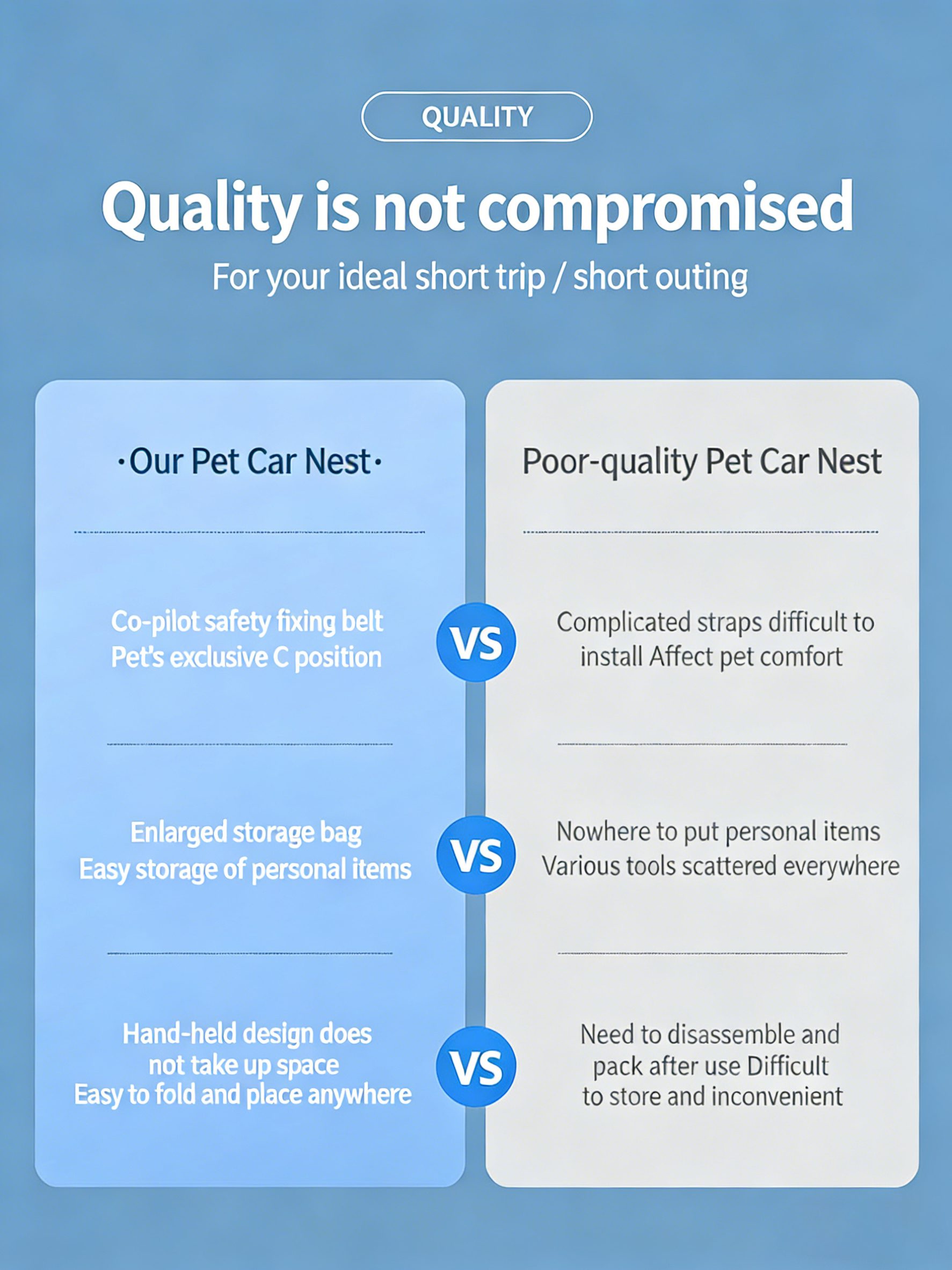 Say goodbye to travel anxiety. From now on, you can confidently take it to explore the world. Our unique all-enclosing high-edge + anti-slip base design fits closely to the arc of various car seats, like a seat belt, firmly locking it in place. The high-edge enclosure provides a deep sense of coverage for your pet, effectively alleviating travel anxiety and preventing it from jumping into the front seat out of curiosity. This can prevent interference during travel from the very beginning, ensuring the safety of both you and your pet. A trip that can be taken at any time, and it will never be absent again.