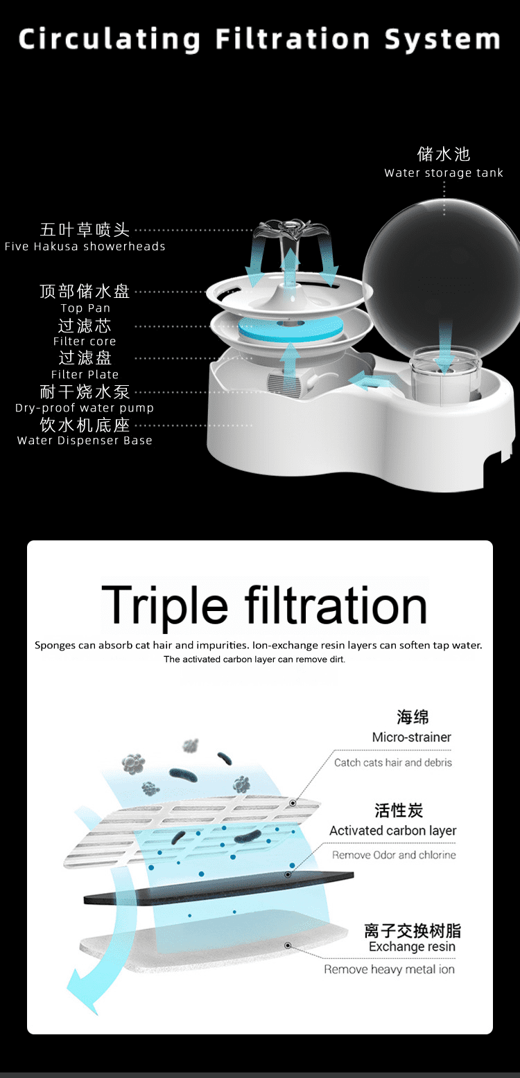 The sponge can absorb cat hair and impurities. The ion exchange resin layer can soften tap water. The activated carbon layer can remove dirt.